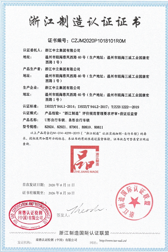 浙江中立集團有限公司是一家專業(yè)生產(chǎn)自行車鎖、摩托車鎖的國家高新技術(shù)企業(yè)。本公司生產(chǎn)的5種型號自行車鎖通過浙江制造認證并獲得認證證書。為切實提高浙江制造“品字標(biāo)”的市場知曉度、認可度和品牌溢價能力,向顧客提供放心產(chǎn)品,本公司對“品字標(biāo)”產(chǎn)品作出以下質(zhì)量承諾。